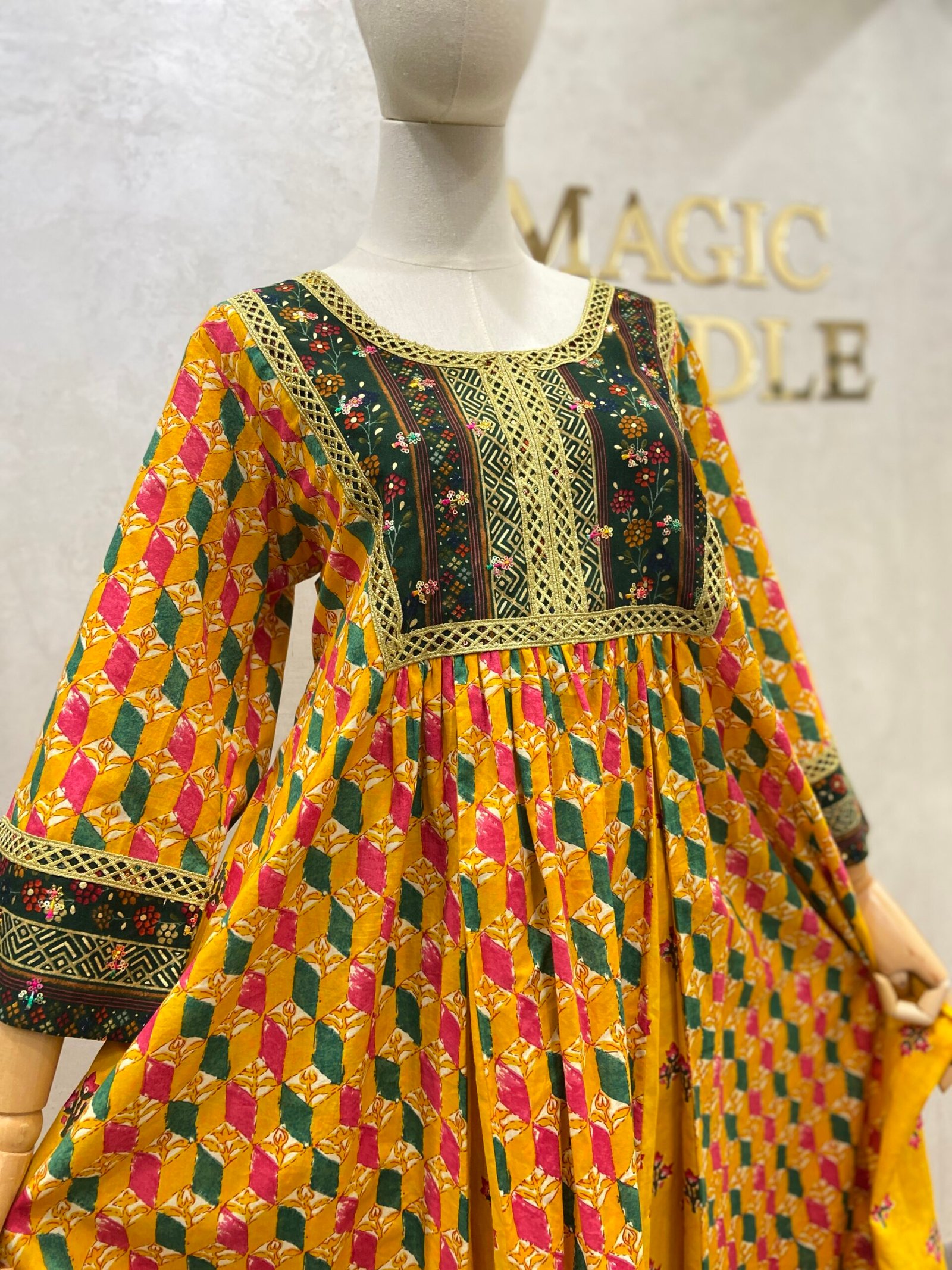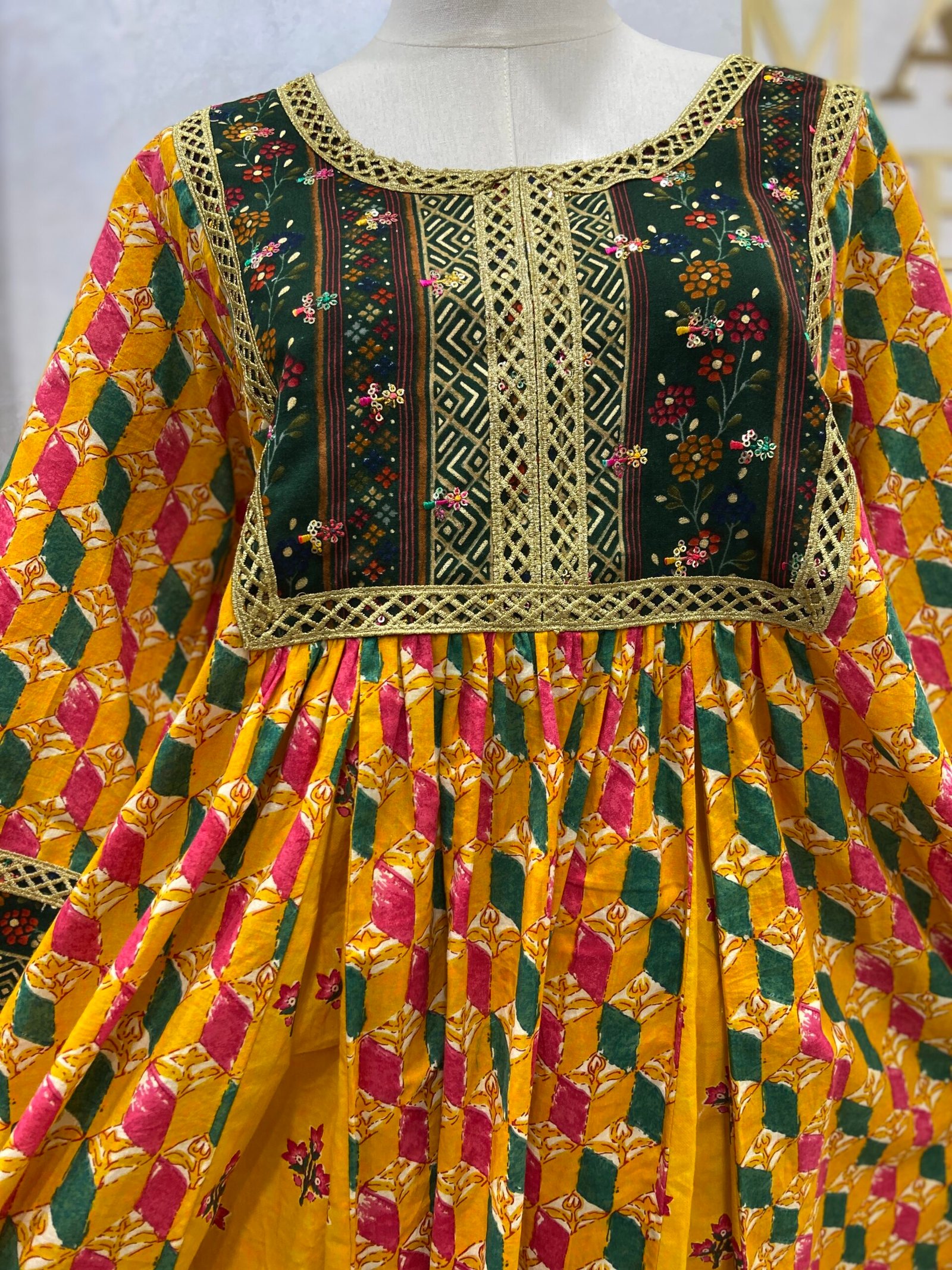 A tailored jalabiya with a center seam, made from breathable Indian cotton, adorned with golden embroidered accents on the neckline and sleeves.