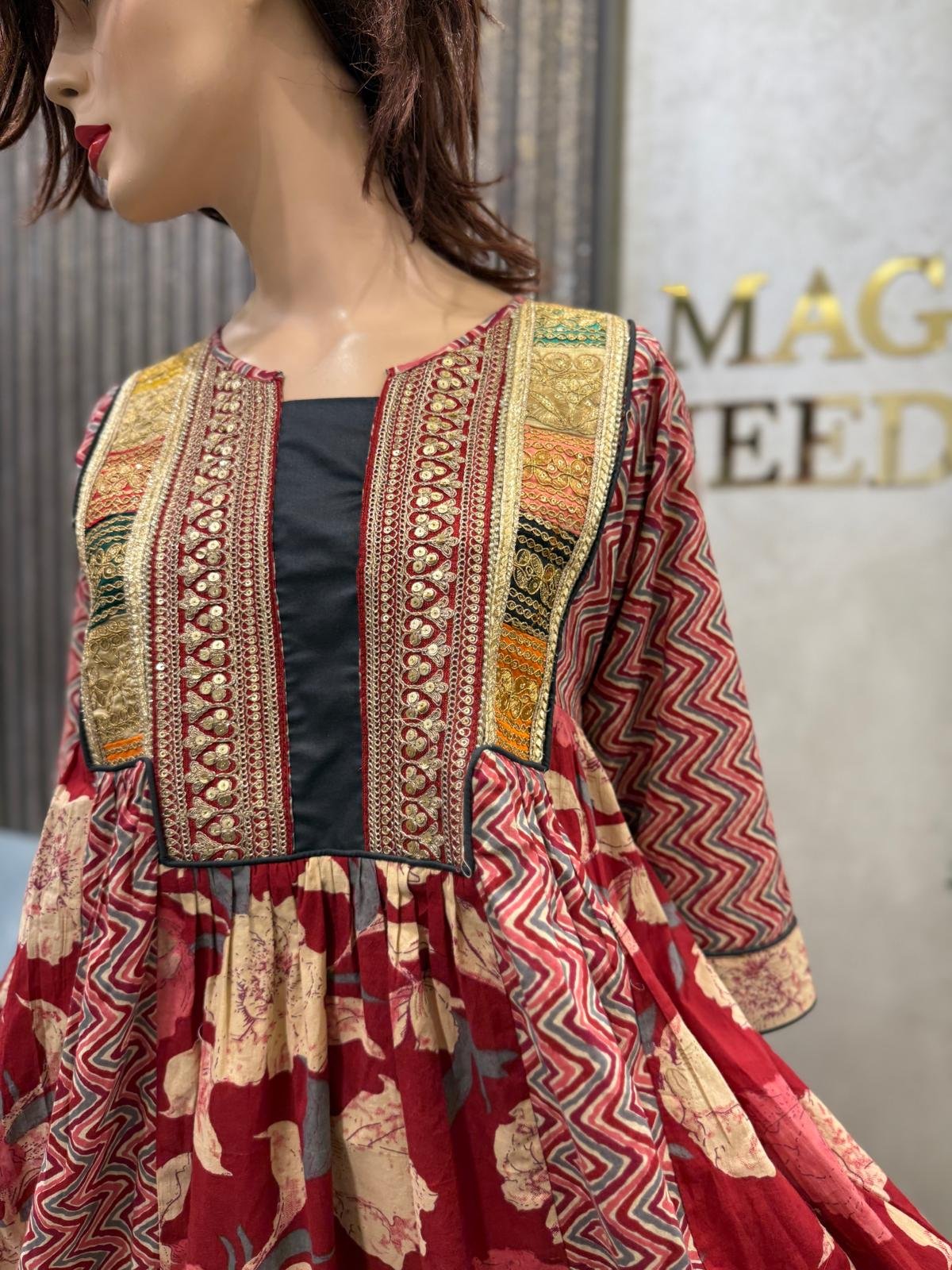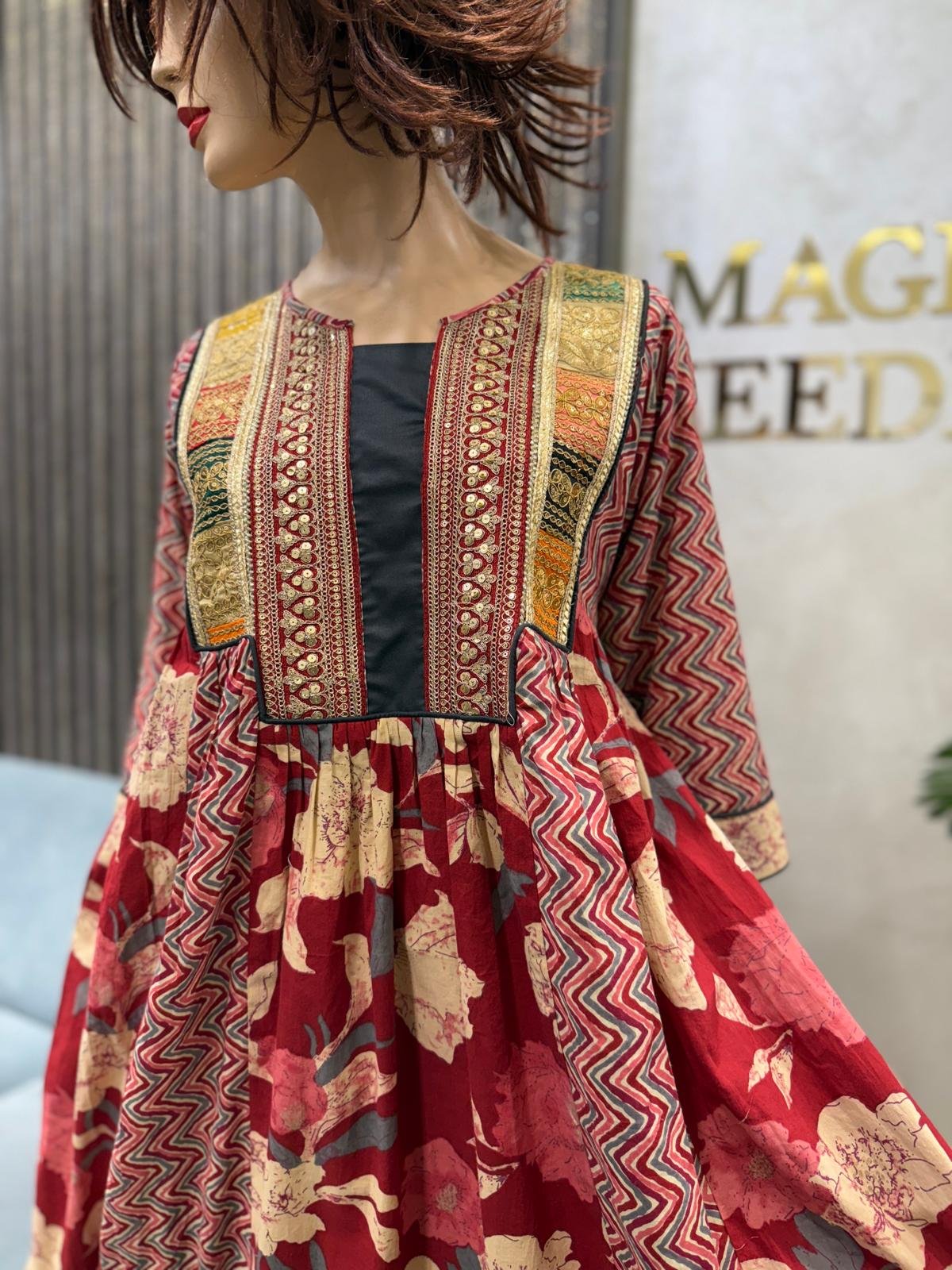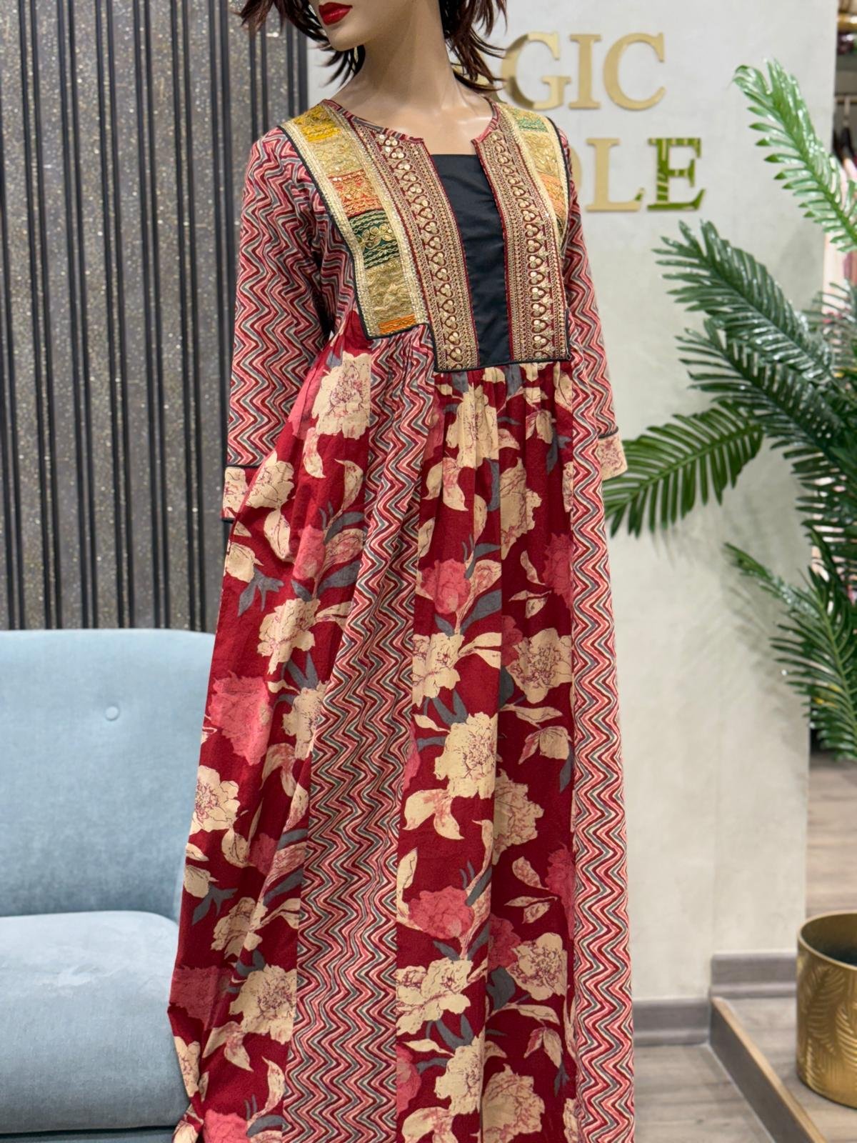 جلابية بعدة قصات في الصدر والخصر .. من قماش القطن الهندي الغني عن التعريف .. مع ازياج مطرزة زاهية جدًا