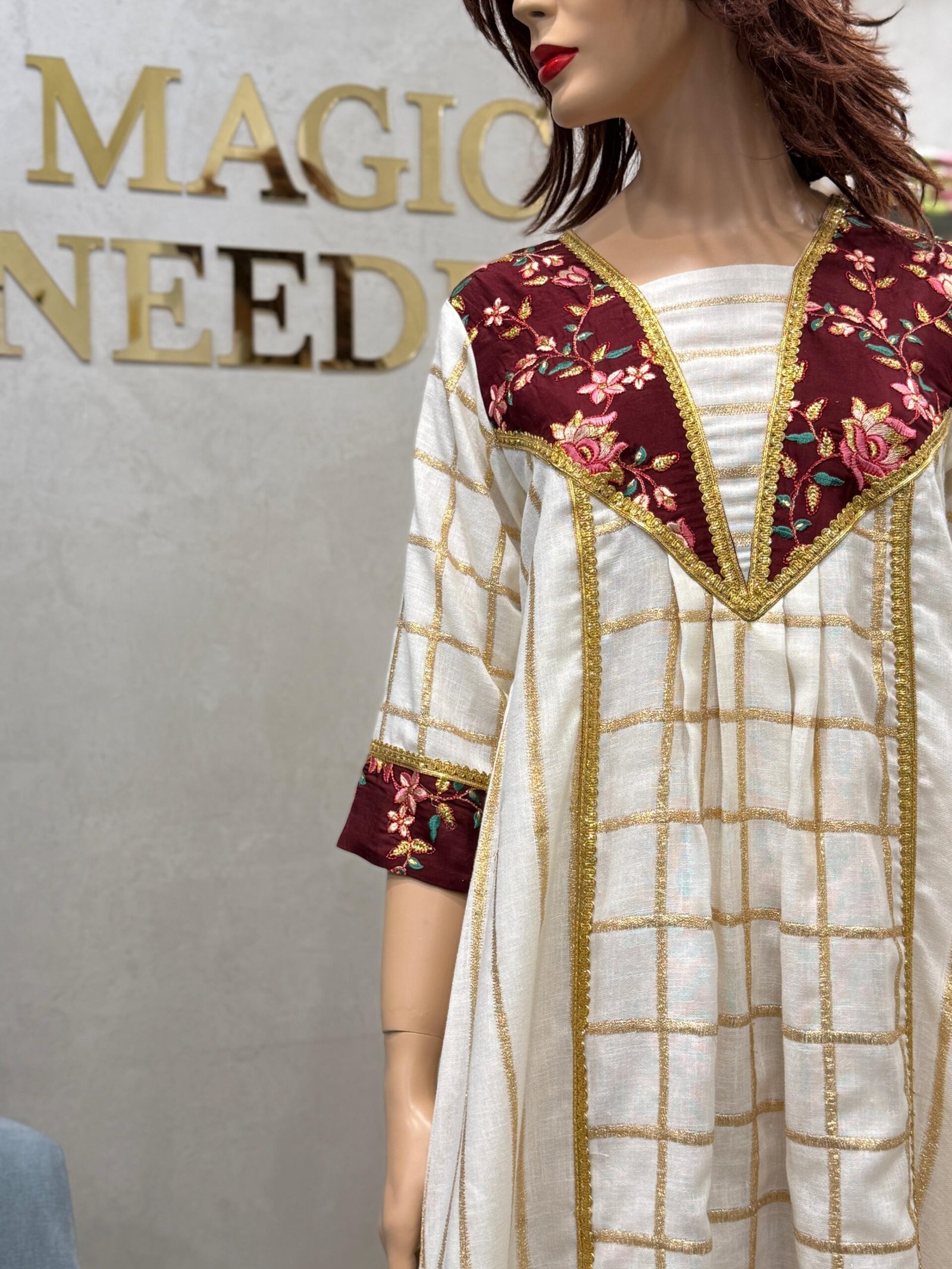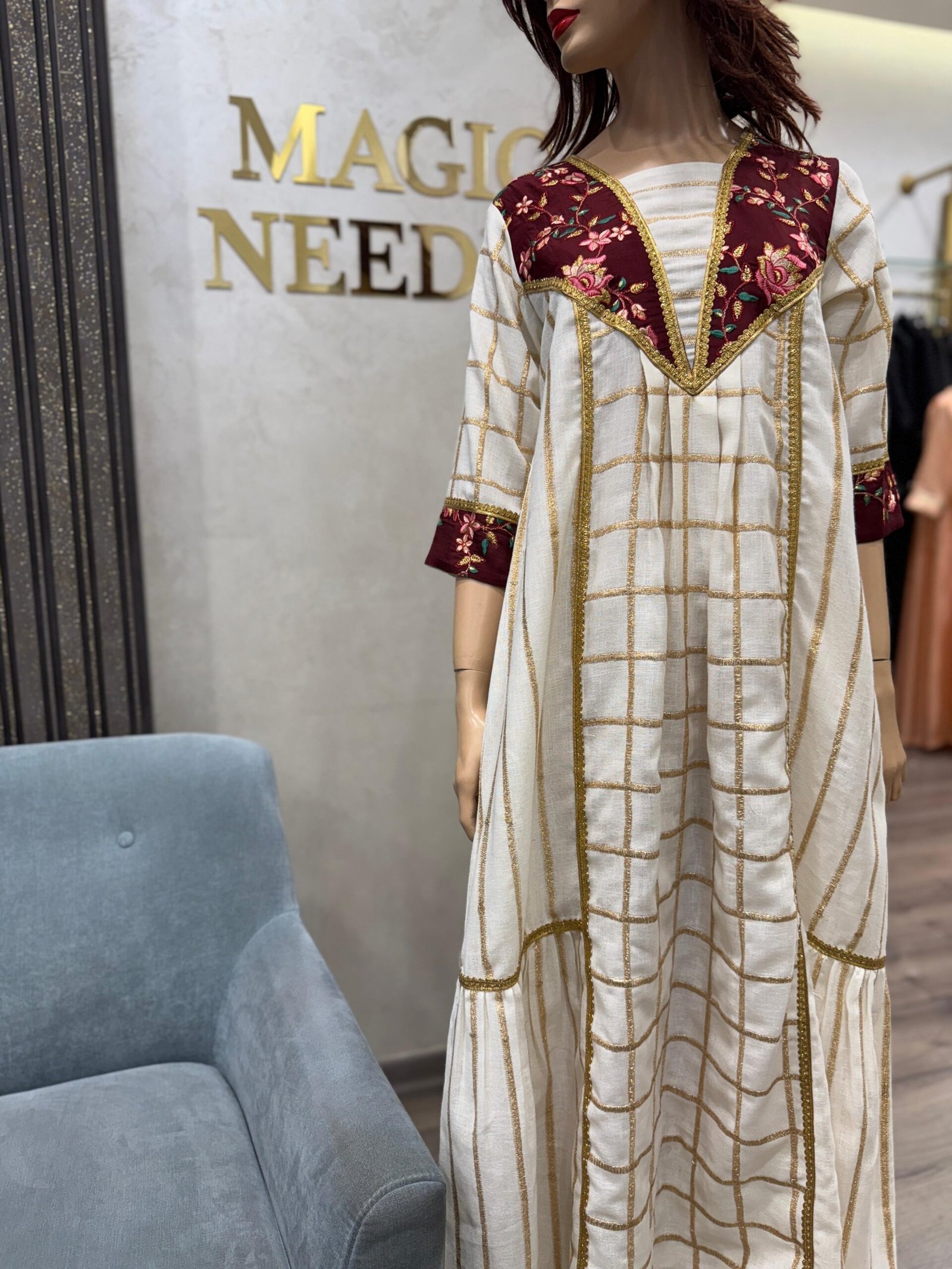 موديل جلابية من قماش اللينين الجميل مع قطعة مطرزة جميلة في الصدر