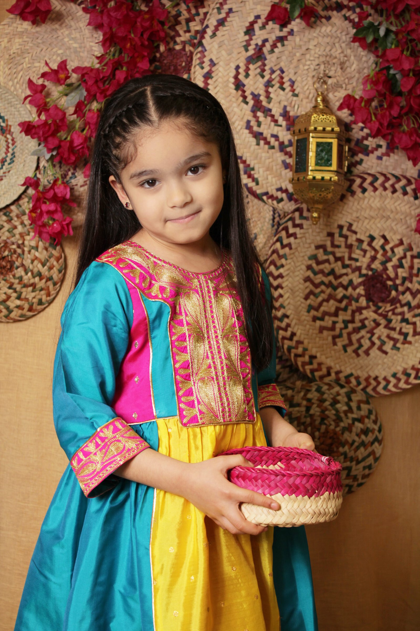 A colorful and beautifully embroidered nasfa dress for little girls, made from Indian silk fabric with golden embroidery.